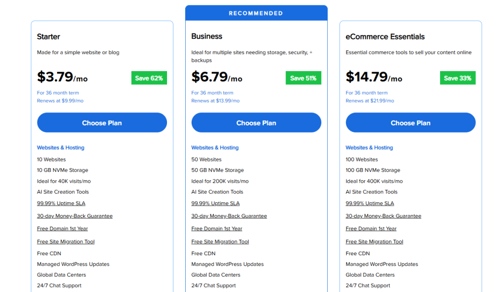- 包含 AI 网站创建工具、99.99% 运行时间 SLA、30 天退款保障